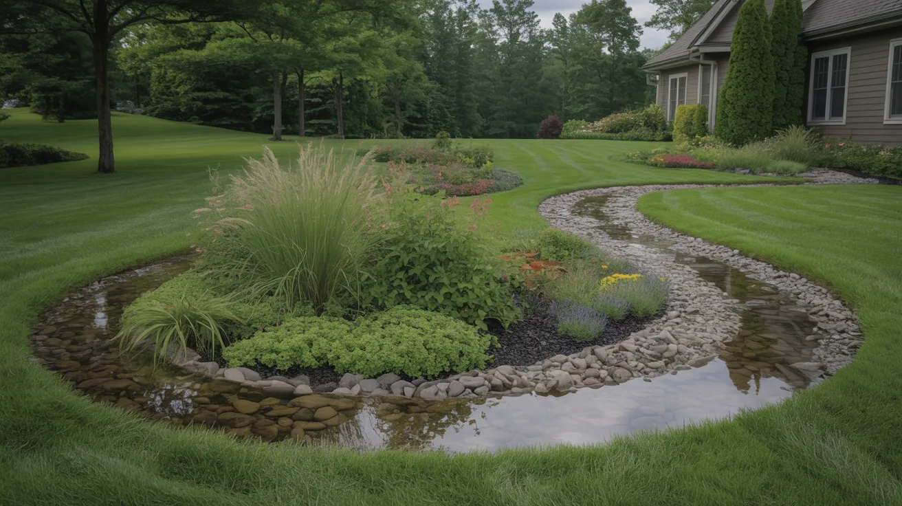Create rain gardens in downhill areas to collect building and turf runoff; size basins for one-inch storm events and plant deep-rooted graminoids and facultative perennials. Perforate compacted zones, then spread with screened compost to restore porosity and water-holding capacity.